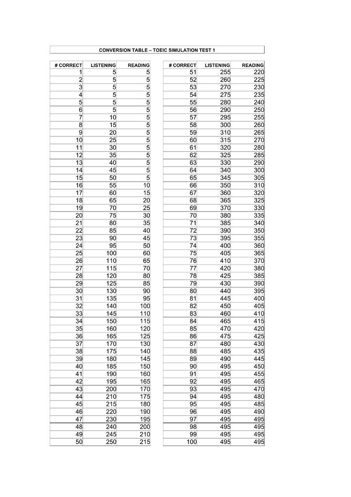 練習完整份模擬測驗後,統計答對的題數就可藉由此表大致推算最後的得分了