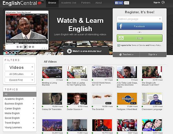 English Central為一綜合型英語學習網站,可以透過看影片練聽力及口 說技巧,裡面提供各式各樣的影片,