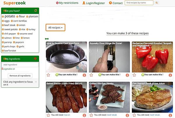 Supercook 是一個互動式的線上食譜網站,你可以在網站左手邊的選單中點選手邊有的食材,系 統就會依照你輸入的食材告訴你你可以做的料理的食譜。此外還可透過下拉式選單選擇你喜愛的料理類型,也可以過濾掉含有自己不能吃的食材的食譜。 Supercook不僅提供我們食譜資訊,還能學到各種食材的英文喔,一起來看看吧!